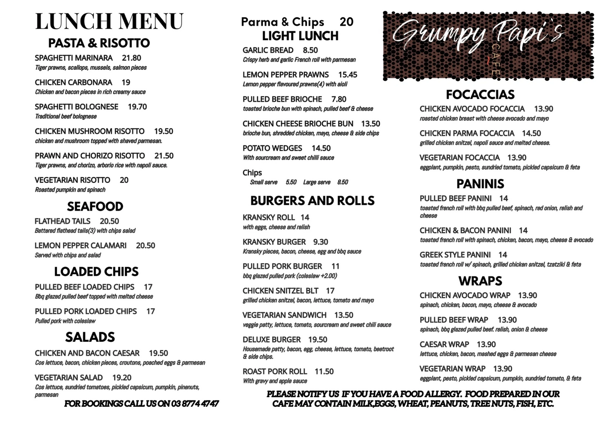 Lunch - satisfy your hunger! Parma and chips, seafood items, pasta and risotto, burgers, rolls, wraps, sandwiches, roast pork meal - check out our menu! If you can't find what you are looking for, ask one of our friendly staff.